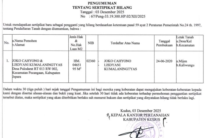Radarmurianews.com – Kementerian Agraria dan Tata Ruang/ Badan Pertanahan Nasional Kantor Pertanahan Kabupaten Kudus...