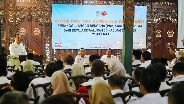 Kudus, radarmurianews.com – Bupati Kudus, Sam’ani Intakoris memerintahkan pembentukan desa/kelurahan tangguh bencana (destana) guna meningkatkan kesiapsiagaan Masyarakat menghadapi bencana. Hal ini diungkapkan saat acara sosialisasi dan penguatan koordinasi dengan seluruh kepala desa dan lurah terkait penanggulangan bencana pada Rabu, 12 November 2025.